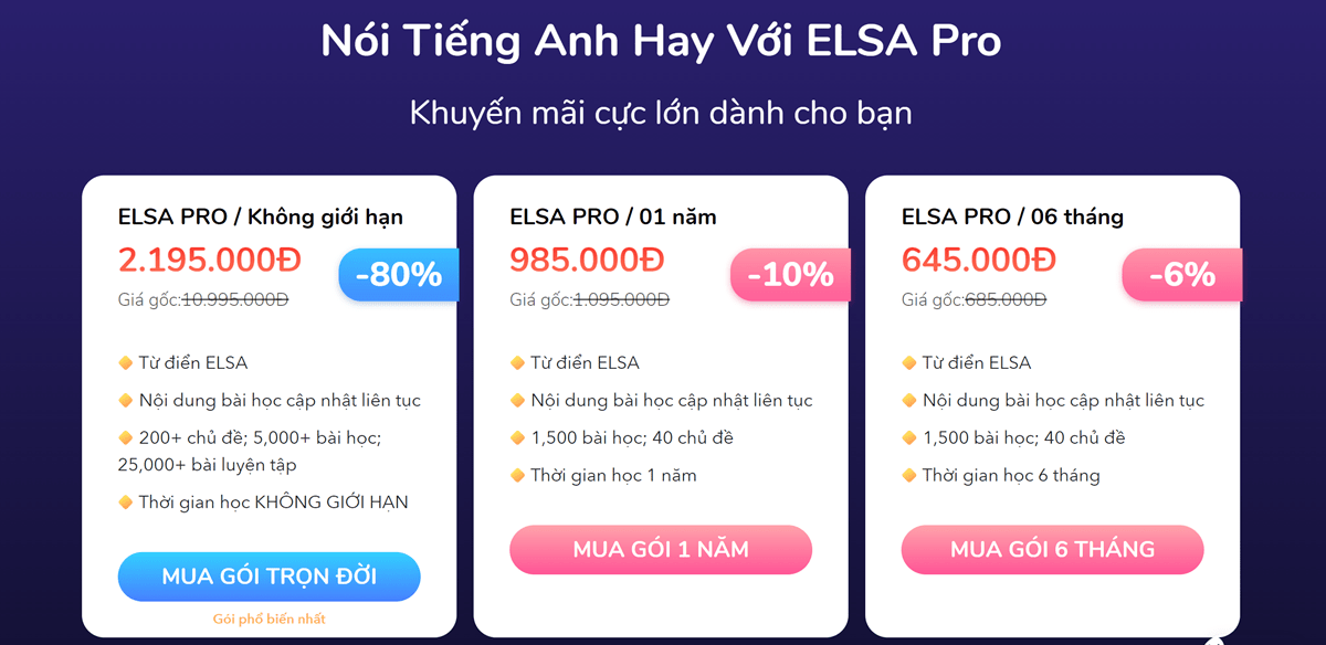 ELSA Pro Trọn Đời: Đối với những người có kế hoạch học tiếng Anh lâu dài, gói trọn đời chỉ với 2.195.000 VNĐ là lựa chọn lý tưởng. Người dùng sẽ có quyền truy cập vô hạn vào tất cả các bài học và tính năng của ELSA Speak mà không lo về chi phí gia hạn hàng năm.