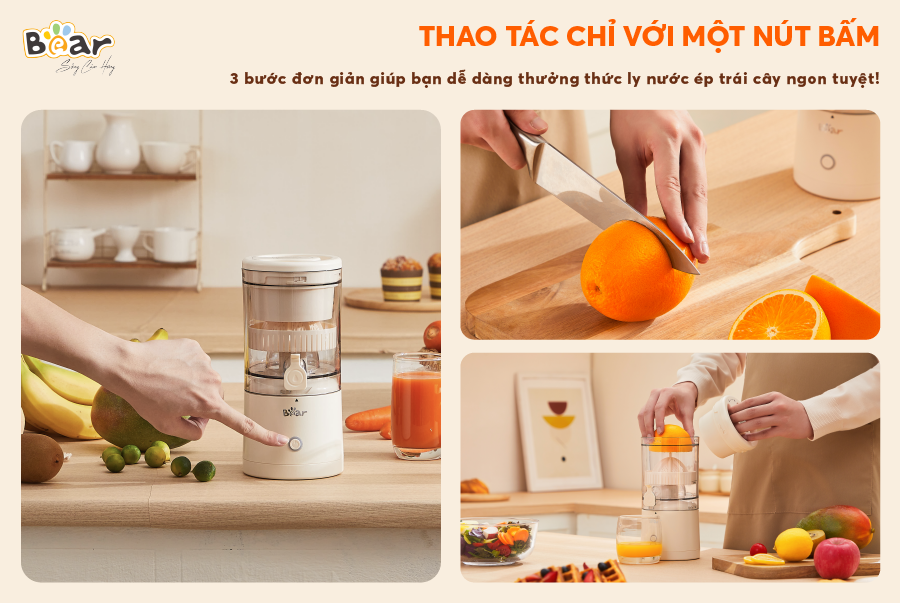 Máy được thiết kế dạng xoáy tự động vô cùng tiện lợi, từ người già đến trẻ nhỏ (trên 8 tuối) đều có thể dễ dàng sử dụng máy vắt cam Bear với thao tác như sau: