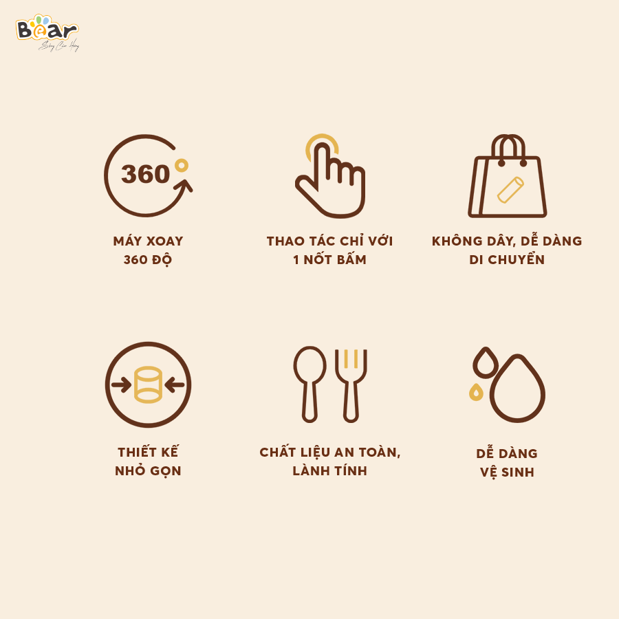 Khác với các dòng máy vắt cam truyền thống trên thị trường, máy vắt cam Bear sử dụng động cơ để tạo ra dòng xoáy vắt cam tự động riêng biệt giúp tăng hiệu quả vắt. Máy tích hợp công nghệ xoay 360 độ giúp vắt cam kiệt nước hơn và còn lại ít bã ơn phương pháp vắt tay truyền thống hoặc vắt một chiều như thông thường.