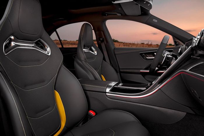 Trên Mercedes-AMG C63 S 2023, xe có ghế trước thể thao AMG Performance, bọc da đục lỗ, phần ôm hông chắc chắn và tựa đầu cố định có huy hiệu AMG. Tính sang trọng và thể thao được kết hợp trên hàng ghế này, vừa giúp người lái cảm thấy tự tin hơn khi đi tốc độ cao, nhưng vẫn có độ thoải mái cần thiết.